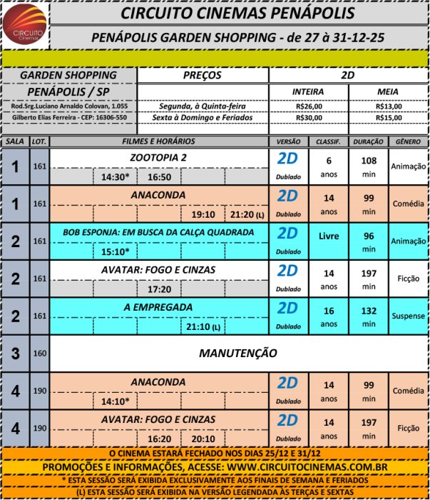 Circuito de Cinema Penápolis - Garden Shopping. Programação vigente de 27/12/2025 até 31/12/2025 https://www.circuit...