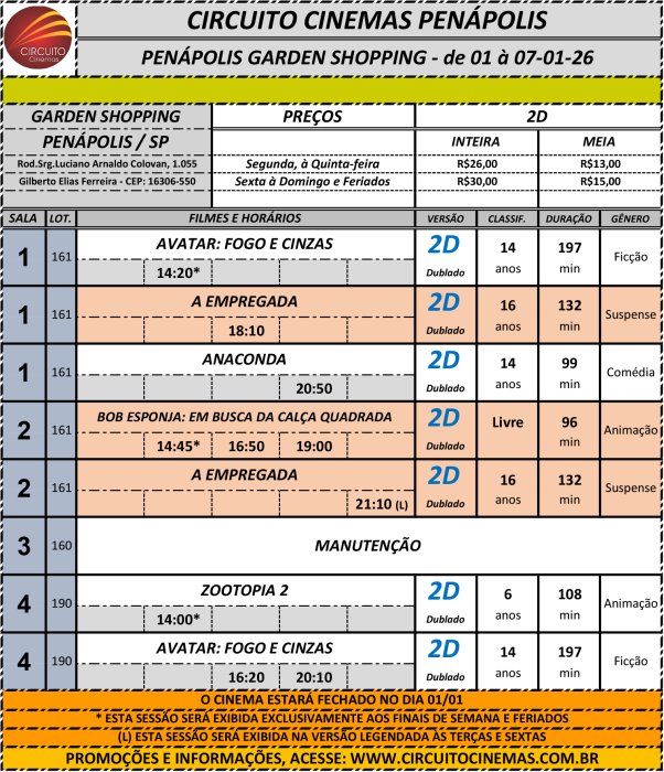 Circuito de Cinema Penápolis - Garden Shopping. Programação vigente de 01/01/2026 até 07/01/2026 https://www.ci...
