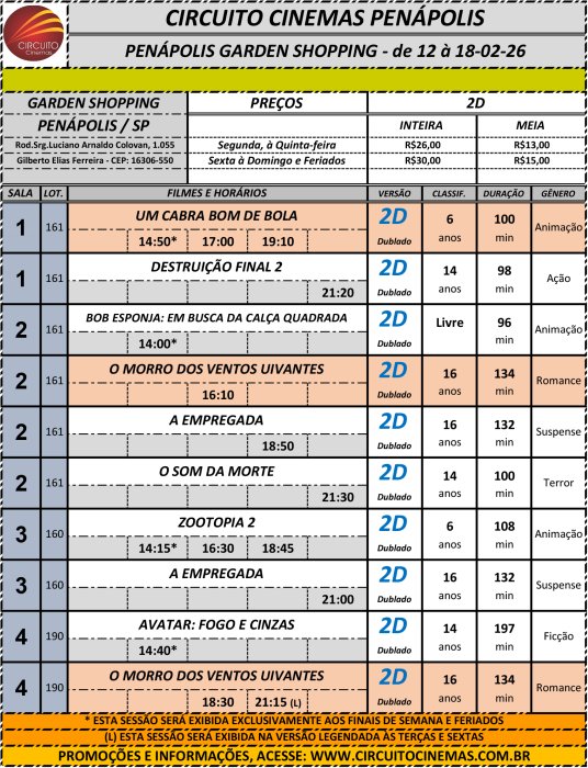 Circuito de Cinema Penápolis - Garden Shopping. Programação vigente de 12/02/2026 até 18/02/2026 https://www.ci...