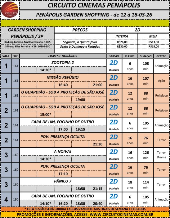 Circuito de Cinema Penápolis - Garden Shopping. Programação vigente de 12/03/2026 até 18/03/2026 https://www.ci...