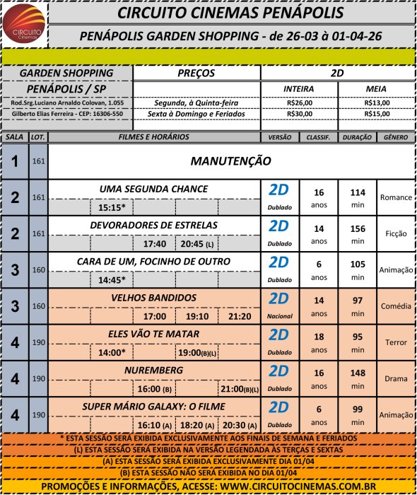 Circuito de Cinema Penápolis - Garden Shopping. Programação vigente de 26/03/2026 até 01/04/2026 https://www.ci...