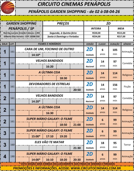 Circuito de Cinema Penápolis - Garden Shopping. Programação vigente de 26/03/2026 até 01/04/2026 https://www.ci...