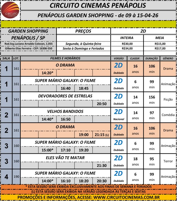 Circuito de Cinema Penápolis - Garden Shopping. Programação vigente de 09/04/2026 até 15/04/2026 https://www.ci...