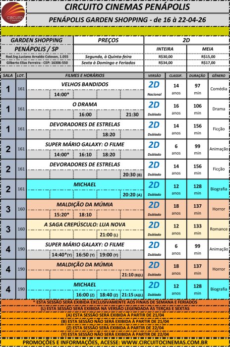 Circuito de Cinema Penápolis - Garden Shopping. Programação vigente de 16/04/2026 até 22/04/2026 https://www.ci...