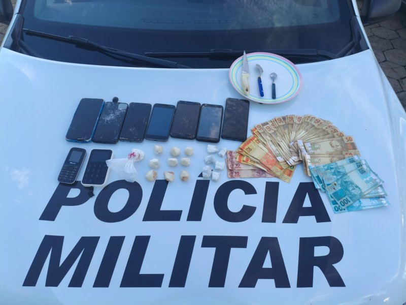 De acordo com informações da corporação, os policiais receberam uma denúncia indicando que produtos de origem furtada estariam armazenados em uma residência. Diante das informações, a equipe se deslocou até o endereço para averiguação e realizou diligências no imóvel. Durante as buscas, os policiais localizaram um fundo falso num guarda-roupa, onde estavam escondidas diversas porções de entorpecentes, incluindo crack, cocaína e maconha. Além das drogas, também foram encontrados dinheiro em espécie, aparelhos celulares e uma máquina de cartão, itens frequentemente associados à prática do tráfico.