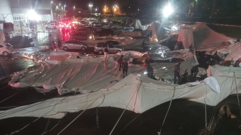 No momento do incidente, o centro de compras estava em funcionamento e a área sob a estrutura abrigava diversos carros e motocicletas. Com a intensidade do vento, a tenda cedeu completamente, fazendo que a lona e os pilares de sustentação fossem ao chão.